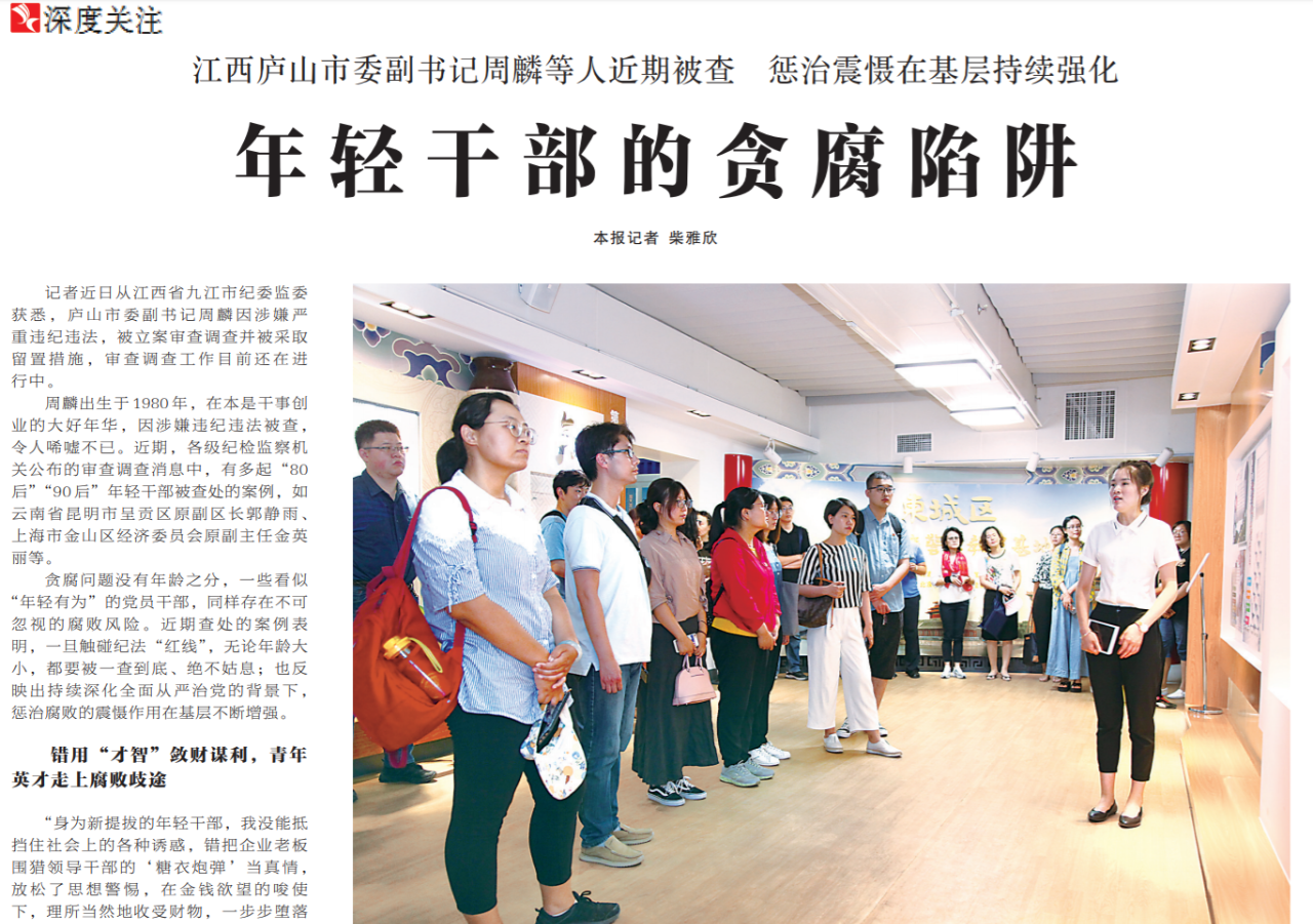 ●中国纪检监察报深度关注专栏发布报道《年轻干部的贪腐陷阱》,剖析江西庐山市委副书记周麟等多起“80后”“90后”年轻干部被查处的案例。文章指出,年轻干部腐败表现存在一定共性,呈现出部分年轻人的社会生活特征:日常生活贪图享乐、爱慕虚荣,甚至热衷炫富攀比。同时对各种诱惑缺乏免疫力,容易在权力漩涡中迷失自我。要把政治标准作为选拔任用年轻干部的首要条件,严把政治关、廉洁关和素质能力关。