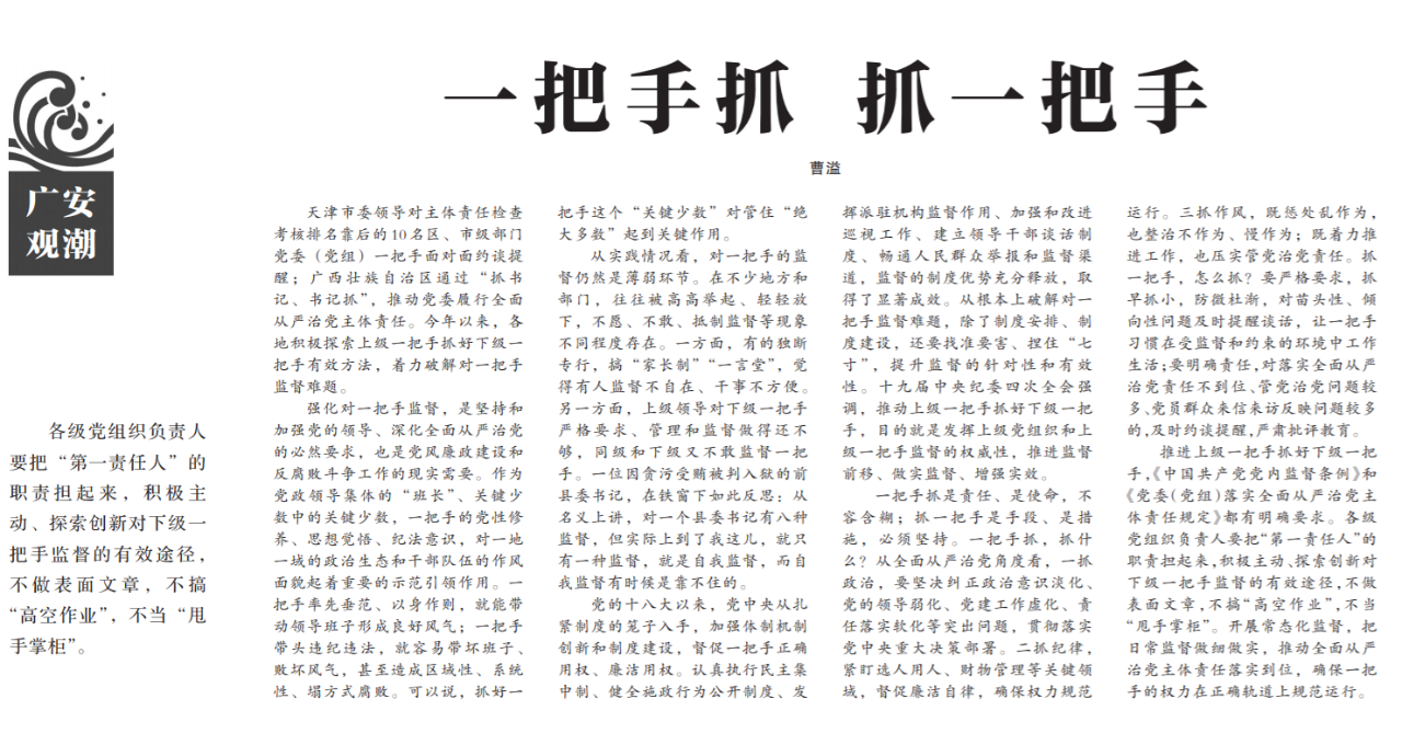 ●今天出版的中国纪检监察报广安观潮专栏发表评论《一把手抓 抓一把手》指出:各级党组织负责人要把“第一责任人”的职责担起来,积极主动、探索创新对下级一把手监督的有效途径,不做表面文章,不搞“高空作业”,不当“甩手掌柜”。