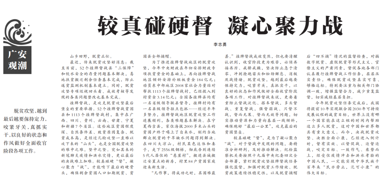 ●今天出版的中国纪检监察报广安观潮专栏发表评论《较真碰硬督 凝心聚力战》指出,纪检监察机关要按照十九届中央纪委四次全会部署,紧盯脱贫攻坚挂牌督战任务强化监督,加强对脱贫工作绩效、脱贫政策连续性稳定性,以及脱贫摘帽后“四不摘”情况的监督检查,对搞数字脱贫、虚假脱贫等形式主义、官僚主义的严肃问责,督促各地各部门认真履行挂牌督战工作任务。