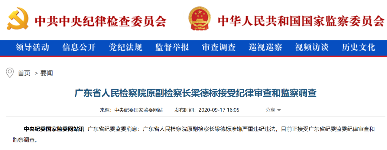 ●中央纪委国家监委网站17日发布通报:广东省人民检察院原副检察长梁德标涉嫌严重违纪违法,目前正接受广东省纪委监委纪律审查和监察调查。