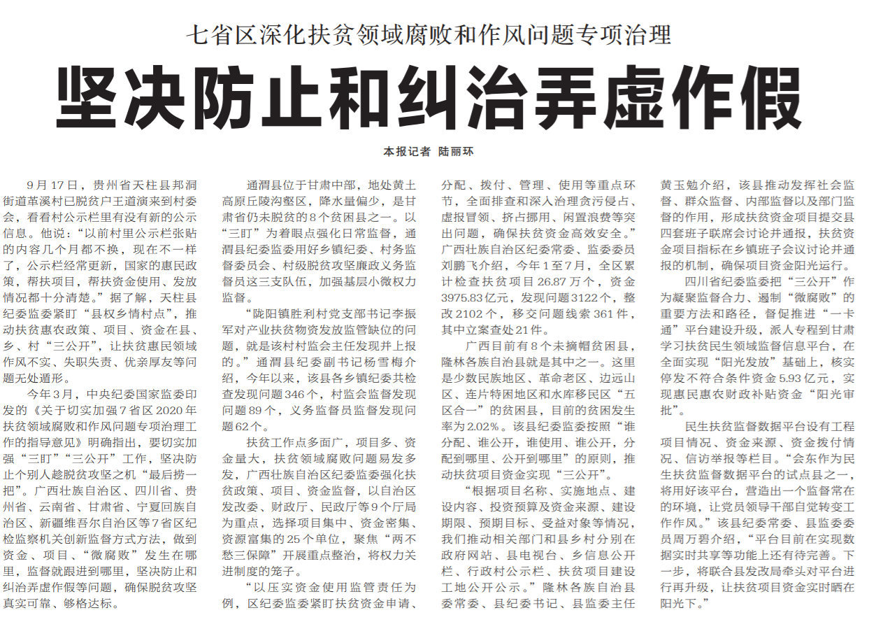 ●今天出版的中国纪检监察报头版头条以《坚决防止和纠治弄虚作假》为题,报道了七省区深化扶贫领域腐败和作风问题专项治理的相关举措,包括聚焦“两不愁三保障”开展重点整治等。