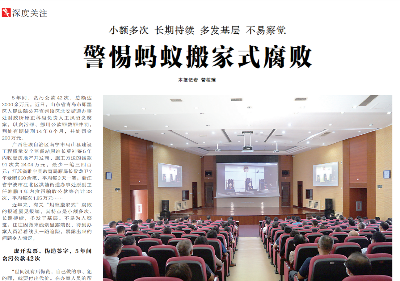 ●今天出版的中国纪检监察报深度关注专栏聚焦蚂蚁搬家式腐败。文章指出,这种腐败的特点是小额多次、长期持续,多发于基层、不易为人察觉,看似不起眼,但带来的危害很大,必须高度警惕。纪检监察机关要针对“蚁贪”多次腐败、多年腐败的突出特点,做实做细日常监督,强化对小微权力的制约和监督,对苗头性倾向性问题及时咬耳扯袖、提醒教育。