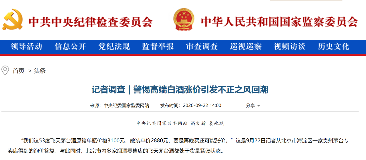 ●临近中秋、国庆双节,以茅台、五粮液等为代表的国内高端白酒涨价、提价的消息不断,多款白酒产品的价格冲上历史高点。中央纪委国家监委网站22日发布记者调查《警惕高端白酒涨价引发不正之风回潮》指出:一旦高端白酒的价格远超大众承受范围,就可能变回‘买的人不喝,喝的人不买’,消解近年来巩固落实中央八项规定精神和纠正‘四风’成果的努力。应继续对党员领导干部违规违纪行为加大监督查处和通报曝光力度,防止隐形变异‘四风’问题反弹回潮。