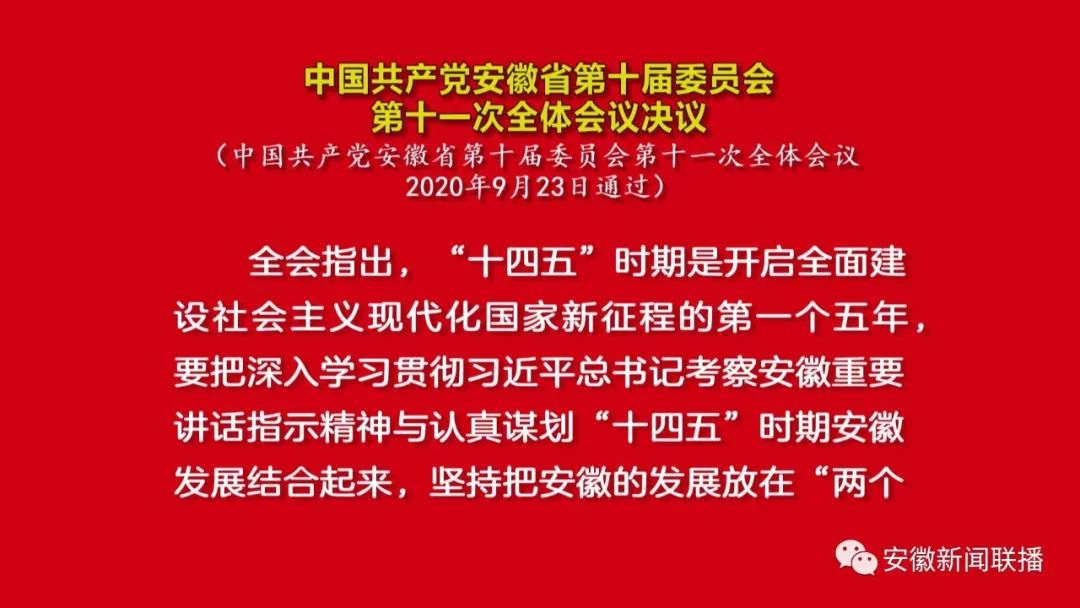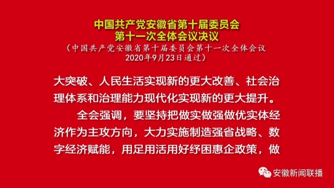 中国共产党安徽省第十届委员会第十一次全体会议,于2020年9月22日至23日在合肥召开。出席这次全会的有,省委委员77人,省委候补委员3人。部分省第十次党代会基层一线代表和有关方面的负责同志列席会议。