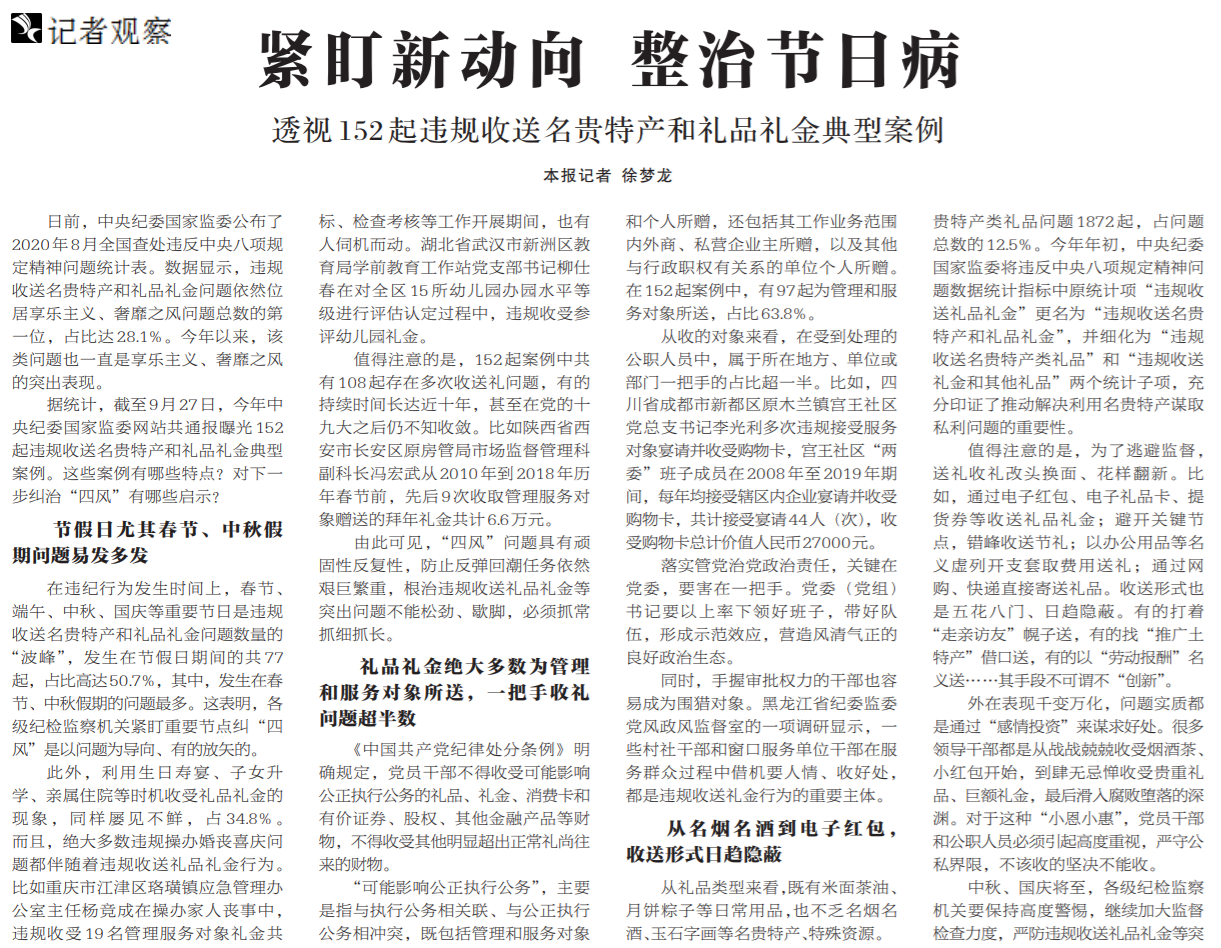 ●截至9月27日,今年中央纪委国家监委网站共通报曝光152起违规收送名贵特产和礼品礼金典型案例。今天出版的中国纪检监察报就此发布记者观察分析指出:这些礼品礼金绝大多数为管理和服务对象所送,一把手收礼问题超半数,同时收送形式日趋隐蔽,各级纪检监察机关要保持高度警惕,继续加大监督检查力度。