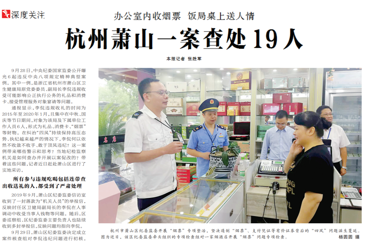 ●今天出版的中国纪检监察报深度关注专栏聚焦浙江省杭州市萧山区卫生健康局原党委委员、副局长李侃违规收受可能影响公正执行公务的礼品和消费卡、接受管理服务对象宴请的典型案例。该案涉及萧山区卫健系统19人,其中8人被给予纪律处分,组织处理11人。