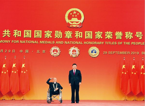 2019年9月29日,中华人民共和国国家勋章和国家荣誉称号颁授仪式在北京人民大会堂金色大厅隆重举行。中共中央总书记、国家主席、中央军委主席习近平向“共和国勋章”获得者张富清颁授勋章。 新华社记者 王晔/摄