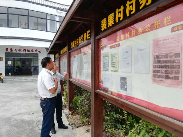 检查组查看村务公示栏,看党务村务公开落实情况。