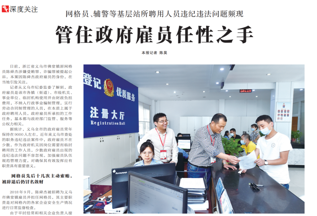 ●今天出版的中国纪检监察报深度关注专栏以《管住政府雇员任性之手》为题,聚焦网格员、辅警等基层站所聘用人员违纪违法问题。文章指出:作为政府机关因岗位需要而临时聘用的工作人员,少数政府雇员出现的违纪违法问题不容忽视。管理失范、违法成本低导致雇员违纪违法问题屡禁不止,应加强雇员队伍规范管理力度,对确保其有效发挥应有职责具有重要意义。