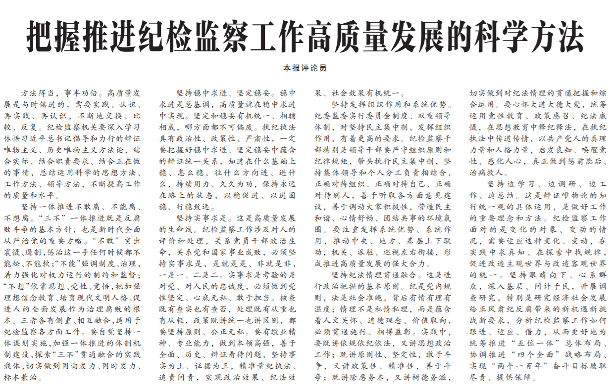 ●今天出版的中国纪检监察报发表评论员文章《把握推进纪检监察工作高质量发展的科学方法》指出:纪检监察机关要深入学习体悟习近平总书记倡导和力行的辩证唯物主义、历史唯物主义方法论,结合实际、结合职责要求、结合正在做的事情,总结运用科学的思想方法、工作方法、领导方法,不断提高工作的质量和水平。