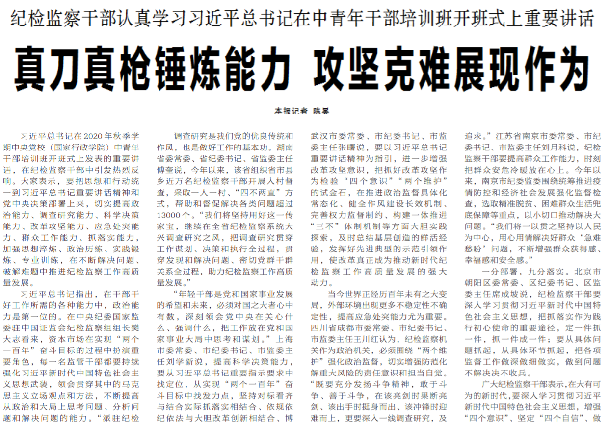 ●今天出版的中国纪检监察报头版头条报道了广大纪检监察干部认真学习习近平总书记在中青年干部培训班开班式上重要讲话的心得体会。