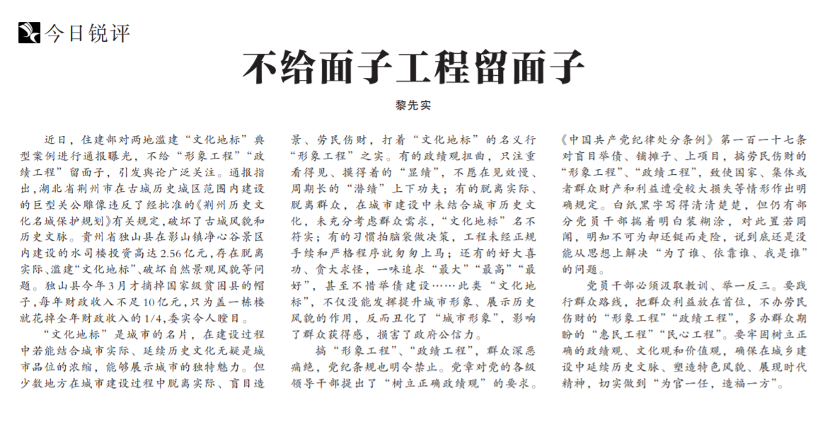 ●近日,住建部对两地滥建“文化地标”典型案例进行通报曝光,引发舆论广泛关注。中国纪检监察报今日就此发表评论《不给面子工程留面子》指出:此类“文化地标”,不仅没能发挥提升城市形象、展示历史风貌的作用,反而丑化了“城市形象”,影响了群众获得感,损害了政府公信力。党员干部必须汲取教训、举一反三,不办劳民伤财的“形象工程”“政绩工程”。