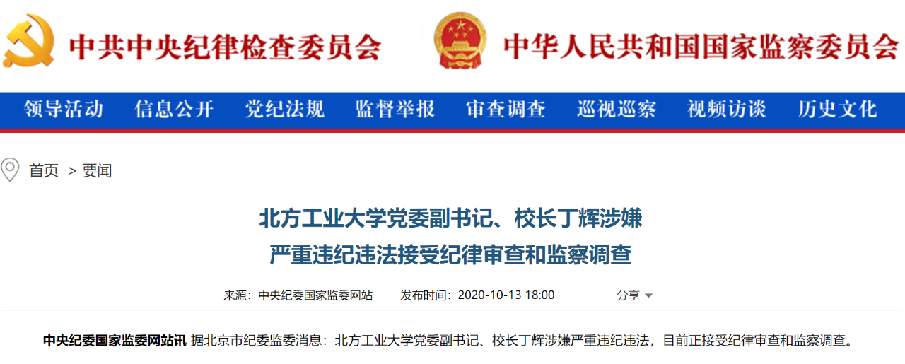 ●中央纪委国家监委网站13日发布通报:北方工业大学党委副书记、校长丁辉涉嫌严重违纪违法,目前正接受纪律审查和监察调查。