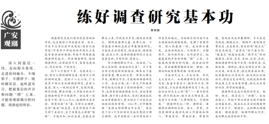 ●今天出版的中国纪检监察报广安观潮专栏发表评论《练好调查研究基本功》指出:调查研究是我们党的传家宝,年轻干部必须在实践中锤炼这项基本功,必须深入到基层一线,把最基层的声音和问题“捞”上来,才能客观准确分析问题,找准症结所在,拿出破解难题的实招、硬招,使理论和政策有根有据、合情合理。