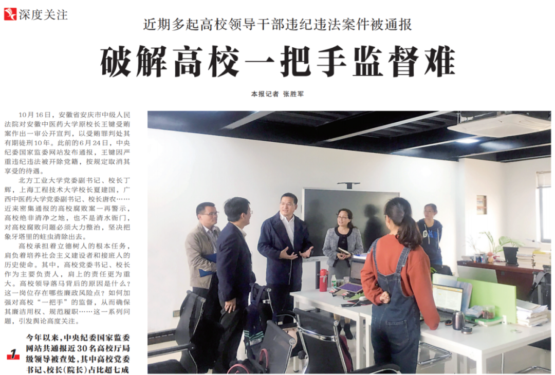 ●今天出版的中国纪检监察报深度关注专栏以《破解高校一把手监督难》为题,聚焦近期通报的多起高校领导干部违纪违法案件。文章指出:高校腐败多集中在基建后勤、选人用人、招生考试、科研经费、校办企业等领域,高校“一把手”问题频发,与高校权力缺乏有效监督制约有关。近期多名高校书记校长被查,印证了高校纪检监察体制改革、巡视巡察监督等方面取得了明显成效。下一步,上级党组织要着力加强对高校领导干部特别是“一把手”行使权力的监督,高校纪检监察机构要协助高校党委落实好全面从严治党主体责任,自身认真履行好监督责任。