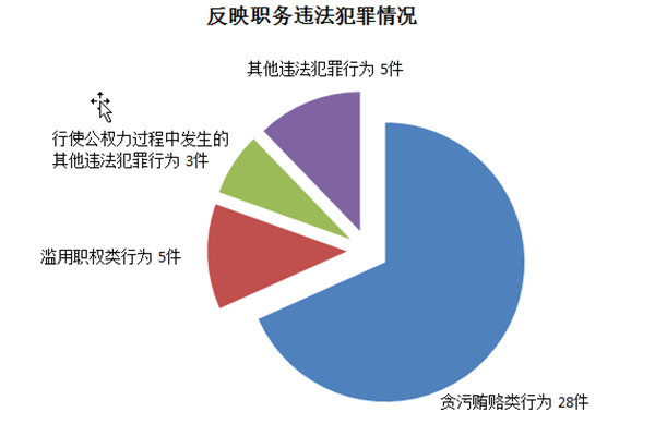 在35件职务违法犯罪行为中,反映贪污贿赂类行为28件,反映滥用职权类行为5件,反映行使公权力过程中发生的其他违法犯罪行为3件。