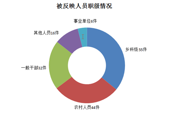 从被反映人职级来看,反映乡科级干部和农村人员的举报占比较多。具体为:反映乡科级干部55件,占36%;反映农村人员44件,占29%;反映一般干部32件,占21%;反映其他人员16件,占比10%;反映事业单位人员件6,占4%。