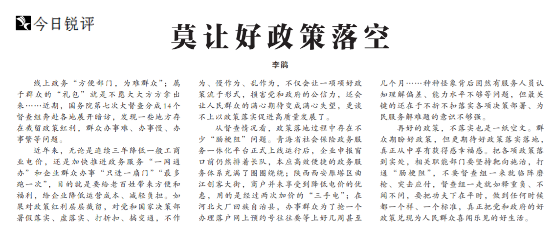 ●今天出版的中国纪检监察报发表评论《莫让好政策落空》指出:近期国务院第七次大督查分成14个督查组奔赴各地展开暗访,发现一些地方存在截留政策红利,群众办事难、办事慢、办事繁等问题。相关职能部门要坚持靶向施治,打通“肠梗阻”,不要督查组一来就临阵磨枪、突击应付,督查组一走就如释重负、不闻不问。
