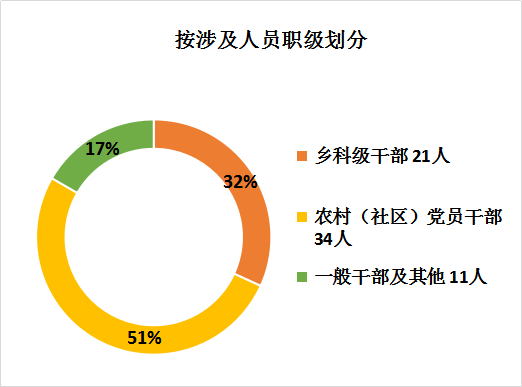 从被反映人员看:反映乡科级干部21人,占总量的32%;反映农村(社区)党员干部34人,占总量的51%,一般干部及其他11人,占总量的17%。