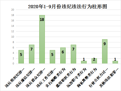 按照反映问题类型分:违反组织纪律行为5件;违反廉洁纪律行为7件;违反群众纪律行为18件;违反工作纪律行为5件;贪污贿赂类行为6件;滥用职权类行为7件;玩忽职守类行为1件;徇私舞弊类行为2件;行使公权力过程中发生的其他违法犯罪行为9件;其他违法犯罪行为1件。