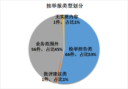 按照举报类型分:检举控告66件,占比53%;业务外56件,占比45%;批评建议1件,占比1%;无实质内容1件,占比1%。
