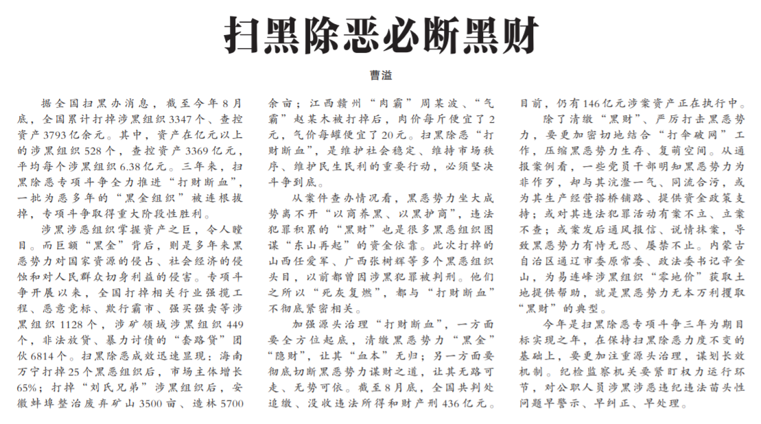 ●截至今年8月底,全国累计打掉涉黑组织3347个、查控资产3793亿余元。其中,资产在亿元以上的涉黑组织528个,查控资产3369亿元,平均每个涉黑组织6.38亿元。今天出版的中国纪检监察报就此发表评论《扫黑除恶必断黑财》指出:加强源头治理“打财断血”,一方面要全方位起底,清缴黑恶势力“黑金”“隐财”,让其“血本”无归;另一方面要彻底切断黑恶势力谋财之道,让其无路可走、无势可依。