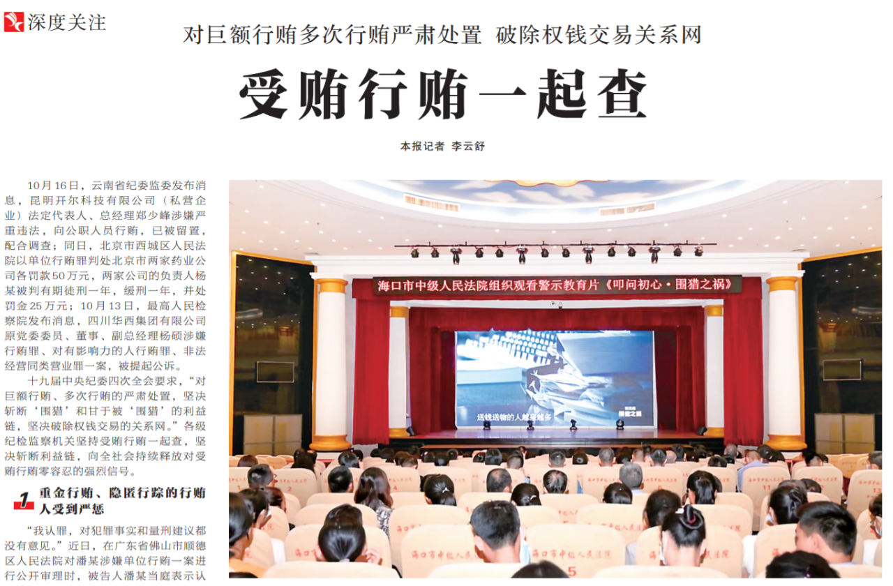 ●今天出版的中国纪检监察报深度关注专栏以《受贿行贿一起查》为题,报道了各级纪检监察机关对巨额行贿多次行贿严肃处置,破除权钱交易关系网的相关举措。文章指出:随着全面从严治党向纵深推进,对受贿和行贿的惩处力度不断加大。要防止只惩戒受贿者却让行贿者逍遥法外的现象发生,通过制度方式,让行贿者得不偿失。