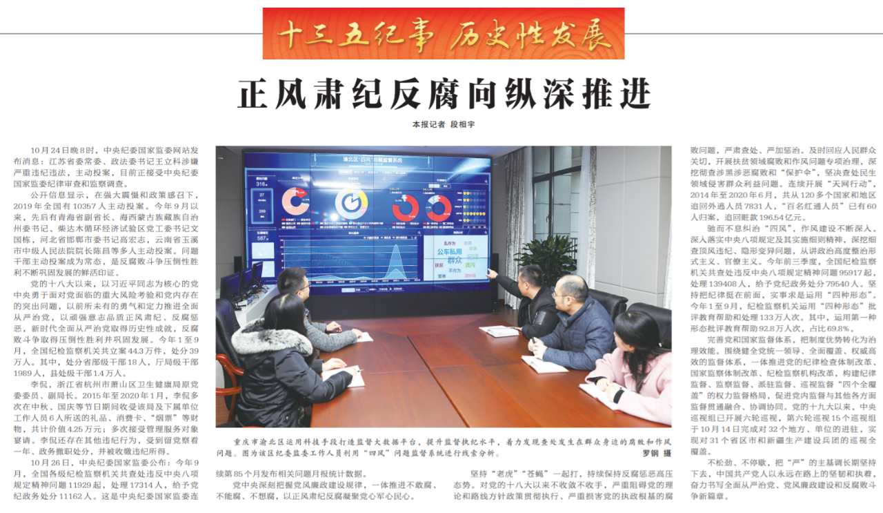 ●今天出版的中国纪检监察报头版头条以《推动实现历史性跨越》为题,报道了各级纪检监察机关聚焦“十三五”规划实施情况强化政治监督的相关举措。目前,“十三五”规划实施顺利,重大战略任务和165项重大工程项目全面落地见效,规划确定的各项目标任务即将胜利完成