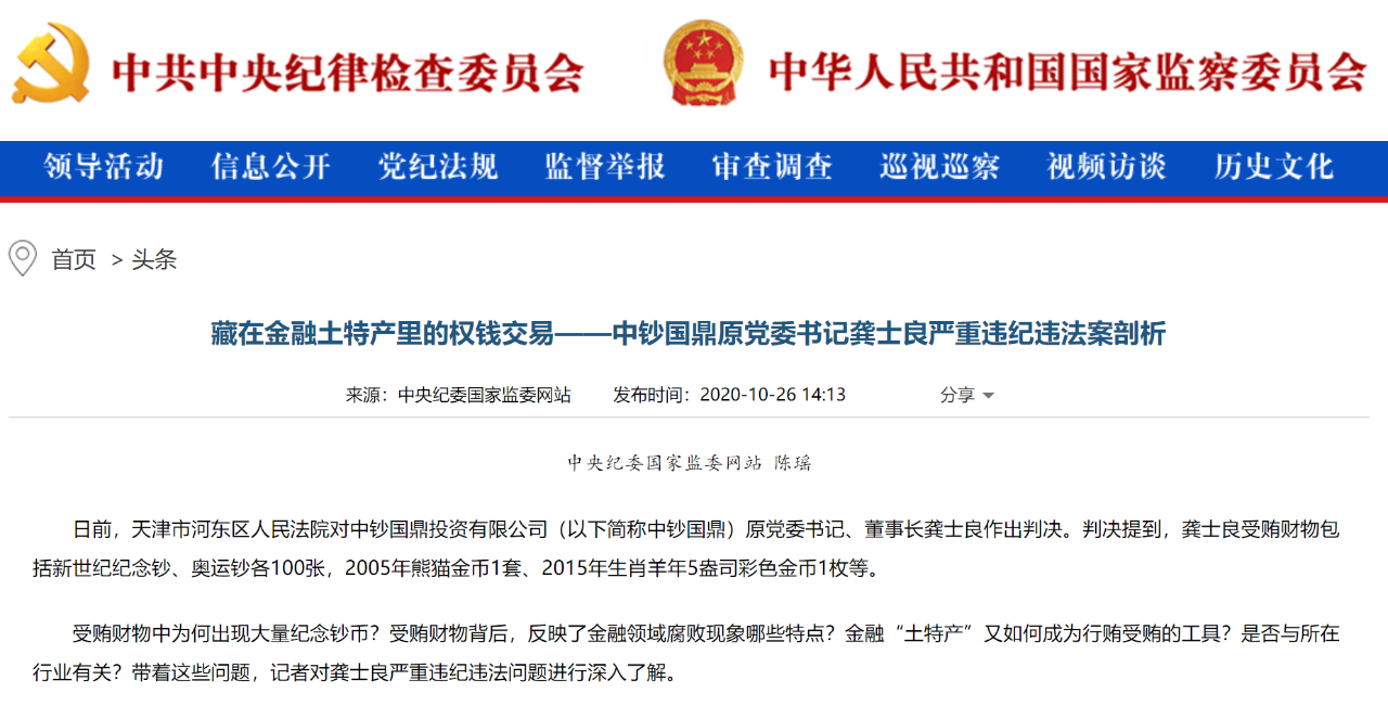 ●中央纪委国家监委网站26日发表报道,剖析中钞国鼎原党委书记龚士良严重违纪违法案。文章指出:人民银行、外汇局系统持有货币金银等特殊资源,从已查处的案件看,相当一段时期内系统内人员对外交往会送些纪念钞、纪念币等金融“土特产”,甚至存在少数人员利用职务便利倒卖大规格贵金属纪念币谋取私利的情况。
