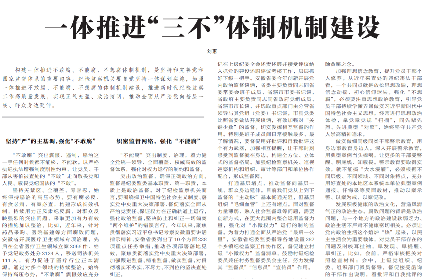 ●今天出版的中国纪检监察报发表安徽省委常委,省纪委书记、省监委主任刘惠署名文章《一体推进“三不”体制机制建设》。文章指出:纪检监察机关要自觉坚持一体谋划实施,加强一体推进不敢腐、不能腐、不想腐的体制机制建设,推进新时代纪检监察工作高质量发展,实现正气充盈、政治清明,推动全面从严治党向基层一线、群众身边延伸。