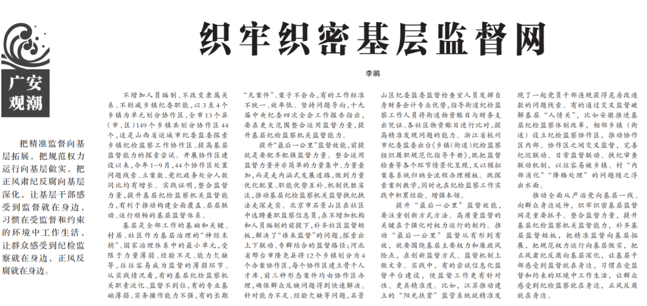 ●今天出版的中国纪检监察报广安观潮专栏发表评论《织牢织密基层监督网》,文章指出:实践证明,整合监督力量,提升基层纪检监察机关监督能力,有利于推动构建全面覆盖、层层联动、运行顺畅的基层监督体系。