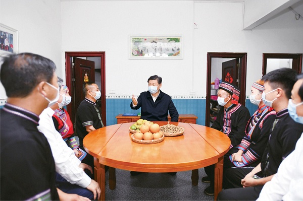 2020年9月16日至18日,中共中央总书记、国家主席、中央军委主席习近平在湖南考察。这是16日下午,在郴州市汝城县文明瑶族乡沙洲瑶族村,习近平同村民朱小红一家拉家常。 新华社记者 谢环驰 摄