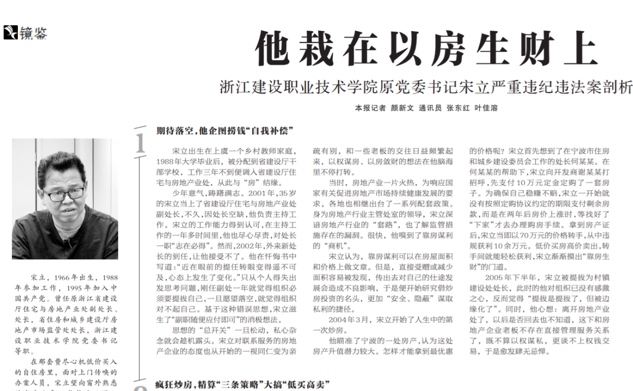 ●今天出版的中国纪检监察报剖析浙江建设职业技术学院原党委书记宋立严重违纪违法案。宋立利用职务便利大搞“低买高卖”进行疯狂炒房,最终因犯受贿罪被判处有期徒刑十年。