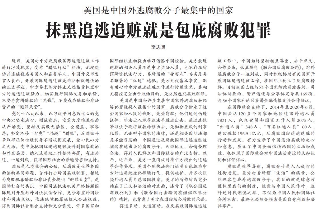 ●针对近期美国对中方反腐败国际追逃追赃工作进行污蔑抹黑的行为,今天出版的中国纪检监察报头版发表评论指出:合作打击跨国腐败犯罪、拒绝为腐败犯罪嫌犯和非法资金提供“避罪天堂”,是国际社会的共识。美国是中国外逃腐败分子最集中的国家,抹黑追逃追赃就是包庇腐败犯罪。