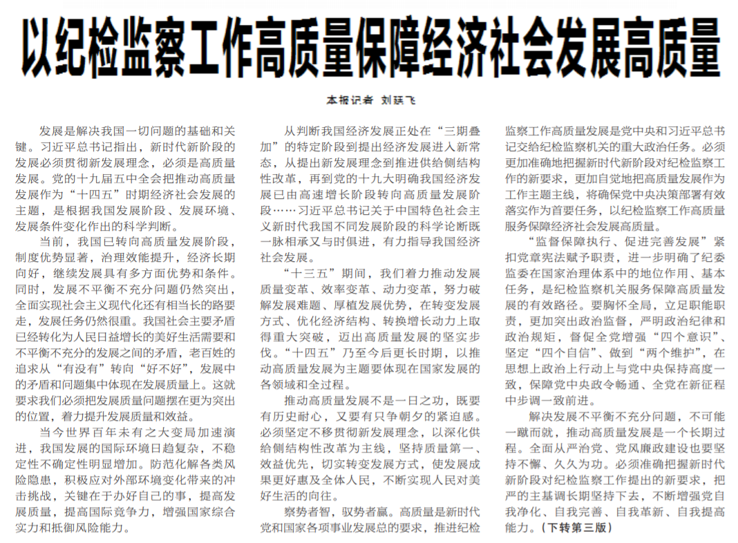 ●今天出版的中国纪检监察报头版头条发表报道《以纪检监察工作高质量保障经济社会发展高质量》,文章指出:各级纪检监察机关和广大纪检监察干部要切实看清纷繁复杂国际国内形势背后的本质,对全面从严治党和反腐败斗争形势始终保持清醒认识。
