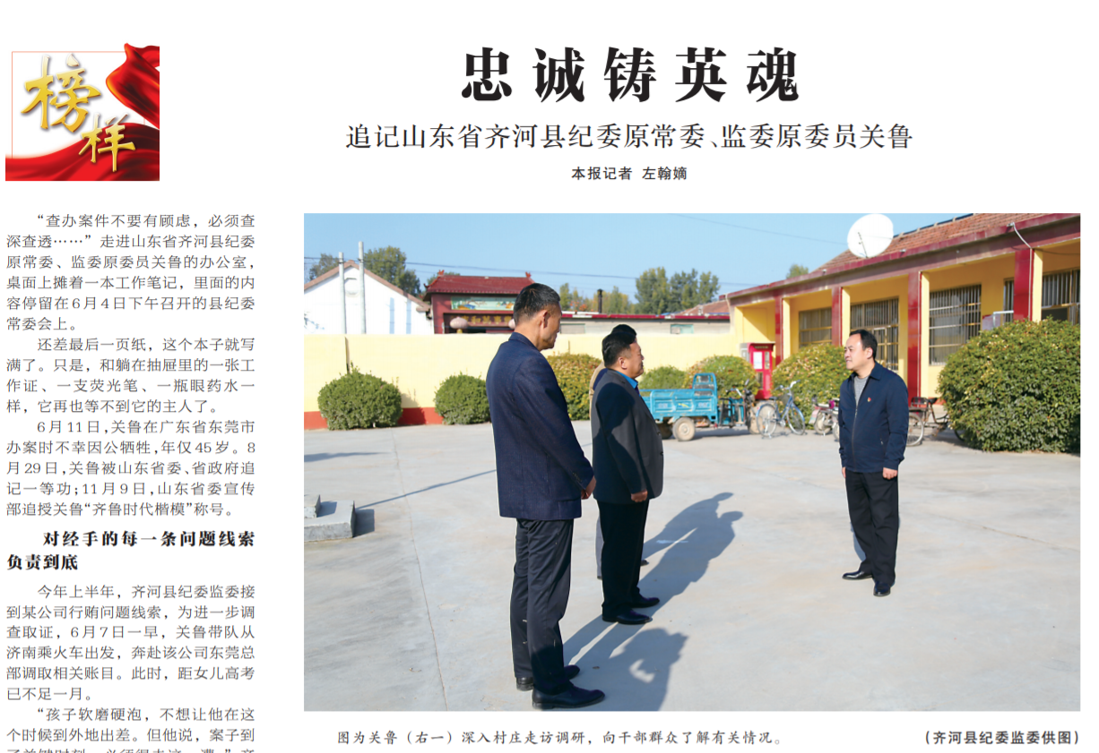 ●今天出版的中国纪检监察报头版以《忠诚铸英魂》为题,追记在东莞办案时不幸因公牺牲的山东省齐河县纪委原常委、监委原委员关鲁的事迹。