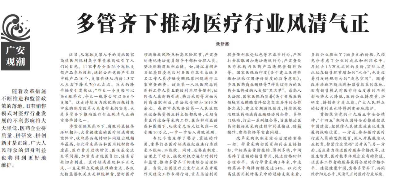 ●今天出版的中国纪检监察报广安观潮专栏发表评论《多管齐下推动医疗行业风清气正》指出:查处个案发挥了警示、震慑的作用,重拳打击医疗领域违纪违法行为丝毫不能松、不能软。同时,还要在制度、治理上下功夫,强化对权力运行的制约和监督,推动多管齐下构建综合治理体系。