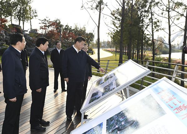 11月12日至13日,中共中央总书记、国家主席、中央军委主席习近平在江苏考察。这是13日下午,习近平在扬州市运河三湾生态文化公园考察,了解运河生态环境保护修复情况。新华社记者 谢环驰 摄