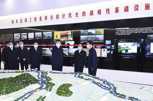 在江都水利枢纽展览馆,习近平边走边看,详细了解水利枢纽发展建设历程和发挥调水、排涝、泄洪、通航、改善生态环境等功能情况。习近平指出,“北缺南丰”是我国水资源分布的显著特点。党和国家实施南水北调工程建设,就是要对水资源进行科学调剂,促进南北方均衡发展、可持续发展。要继续推动南水北调东线工程建设,完善规划和建设方案,确保南水北调东线工程成为优化水资源配置、保障群众饮水安全、复苏河湖生态环境、畅通南北经济循环的生命线。要把实施南水北调工程同北方地区节约用水统筹起来,坚持调水、节水两手都要硬,一方面要提高向北调水能力,另一方面北方地区要从实际出发,坚持以水定城、以水定业,节约用水,不能随意扩大用水量。习近平强调,南水北调东线工程取得的重大成就,离不开数十万建设者长期的辛勤劳动,离不开沿线40万移民的巨大奉献。要依托大型水利枢纽设施和江都水利枢纽展览馆,积极开展国情和水情教育,引导干部群众特别是青少年增强节约水资源、保护水生态的思想意识和行动自觉,加快推动生产生活方式绿色转型。