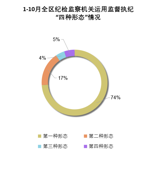 1-10月,全区纪检监察机关运用监督执纪“四种形态”处理275人次。其中,第一种形态203人次,占“四种形态”处理总人次的73.8%;第二种形态46人次,占16.7%;第三种形态12人次,占4.4%;第四种形态14人次,占5.1%。