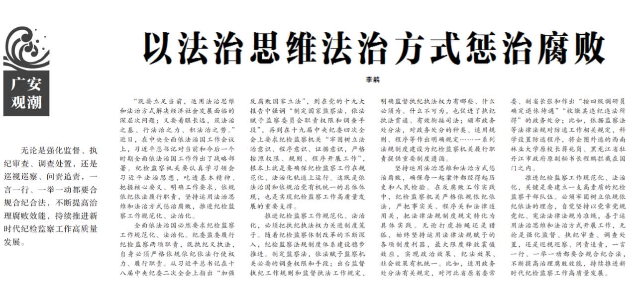 ●今天出版的中国纪检监察报广安观潮专栏发表评论《以法治思维法治方式惩治腐败》,文章指出:无论是强化监督、执纪审查、调查处置,还是巡视巡察、问责追责,一言一行、一举一动都要合规合纪合法,不断提高治理腐败效能。