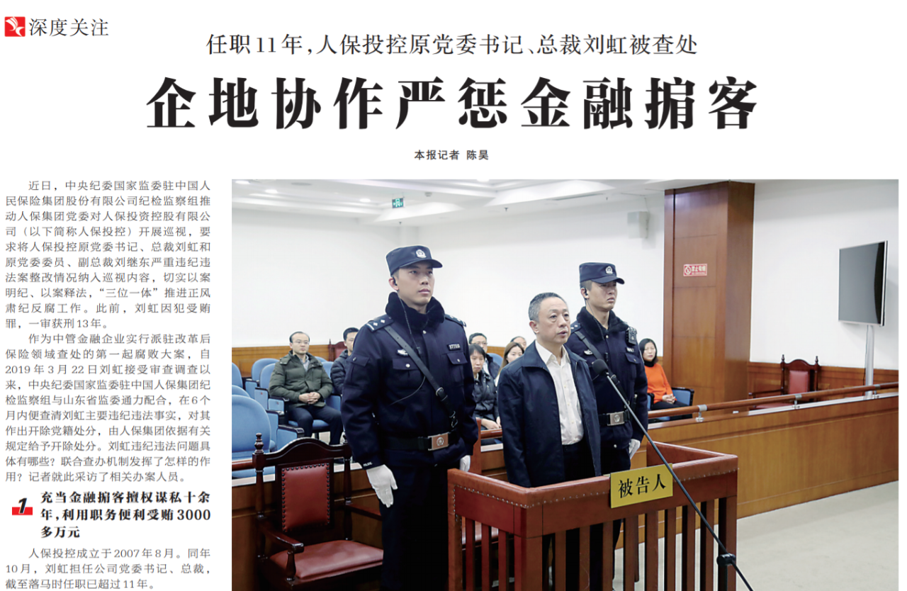 ●今天出版的中国纪检监察报以《企地协作严惩金融掮客》为题,报道了人保投控原党委书记、总裁刘虹严重违纪违法案。该案也是中管金融企业实行派驻改革后保险领域查处的第一起腐败大案。报道指出:金融领域以权谋私问题频发,暴露内部治理和外部监督缺位问题。由中央纪委国家监委派驻相应金融单位纪检监察组与地方纪委监委联合办案,已成为查处金融领域违纪违法问题的一项常规做法。