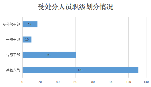 按处分人员职级划分,其中乡科级干部17人、一般干部10人、村级干部61人、其他人员131人。