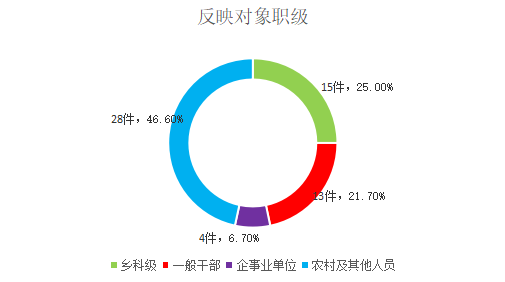 在60件检举控告信访举报中,按被反映对象职级分:乡科级15件,占比25%;一般干部13件,占比21.7%;企事业单位4件,占比6.7%;农村及其他人员28件,占比46.6%。(滁州市纪委监委)