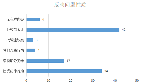 按反映问题性质分:反映违反纪律行为34件,涉嫌职务犯罪17件,其他涉法行为4件,批评建议3件,业务范围外42件,无实质内容6件。