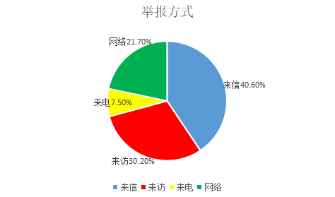 按举报方式分:来信43件,占信访总量的40.6%;来访32件,占比30.2%;来电8件,占比7.5%;网络举报23件,占比21.7%。
