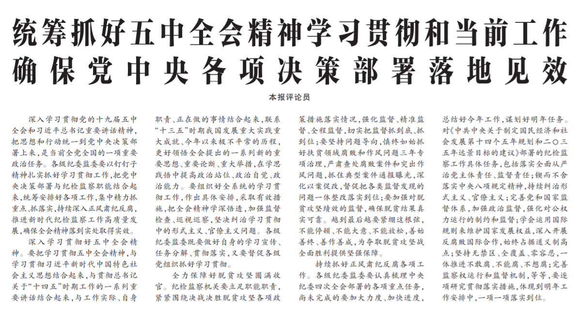 ●今天出版的中国纪检监察报发表评论员文章《统筹抓好五中全会精神学习贯彻和当前工作 确保党中央各项决策部署落地见效》。文章指出:各级纪委监委要以钉钉子精神扎实抓好学习贯彻工作,把党中央决策部署与纪检监察职能结合起来,统筹安排好各项工作,集中精力抓重点、抓落实,持续深入正风肃纪反腐,推进新时代纪检监察工作高质量发展,确保全会精神落到实处取得实效。