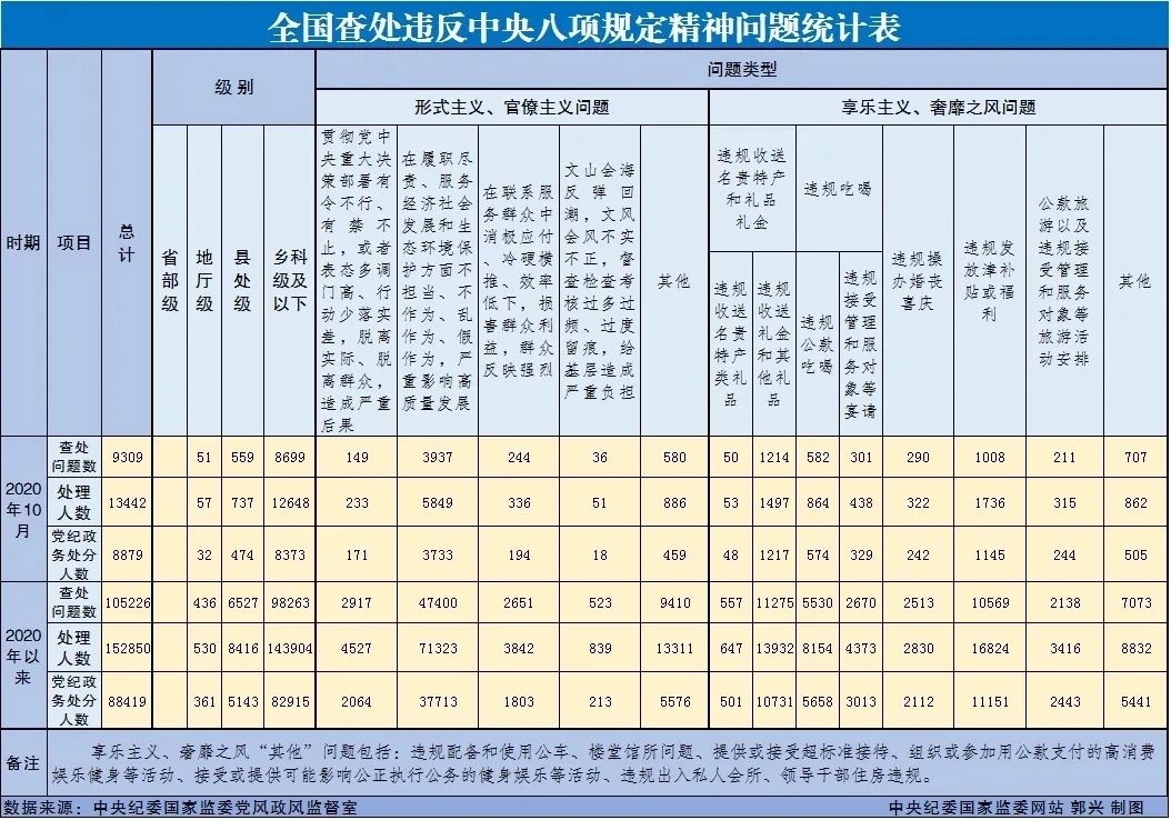 ●23日,中央纪委国家监委公布2020年10月全国查处违反中央八项规定精神问题汇总情况。当月,全国各级纪检监察机关共查处违反中央八项规定精神问题9309起,处理13442人,给予党纪政务处分8879人。这是中央纪委国家监委连续第86个月公布月报数据。