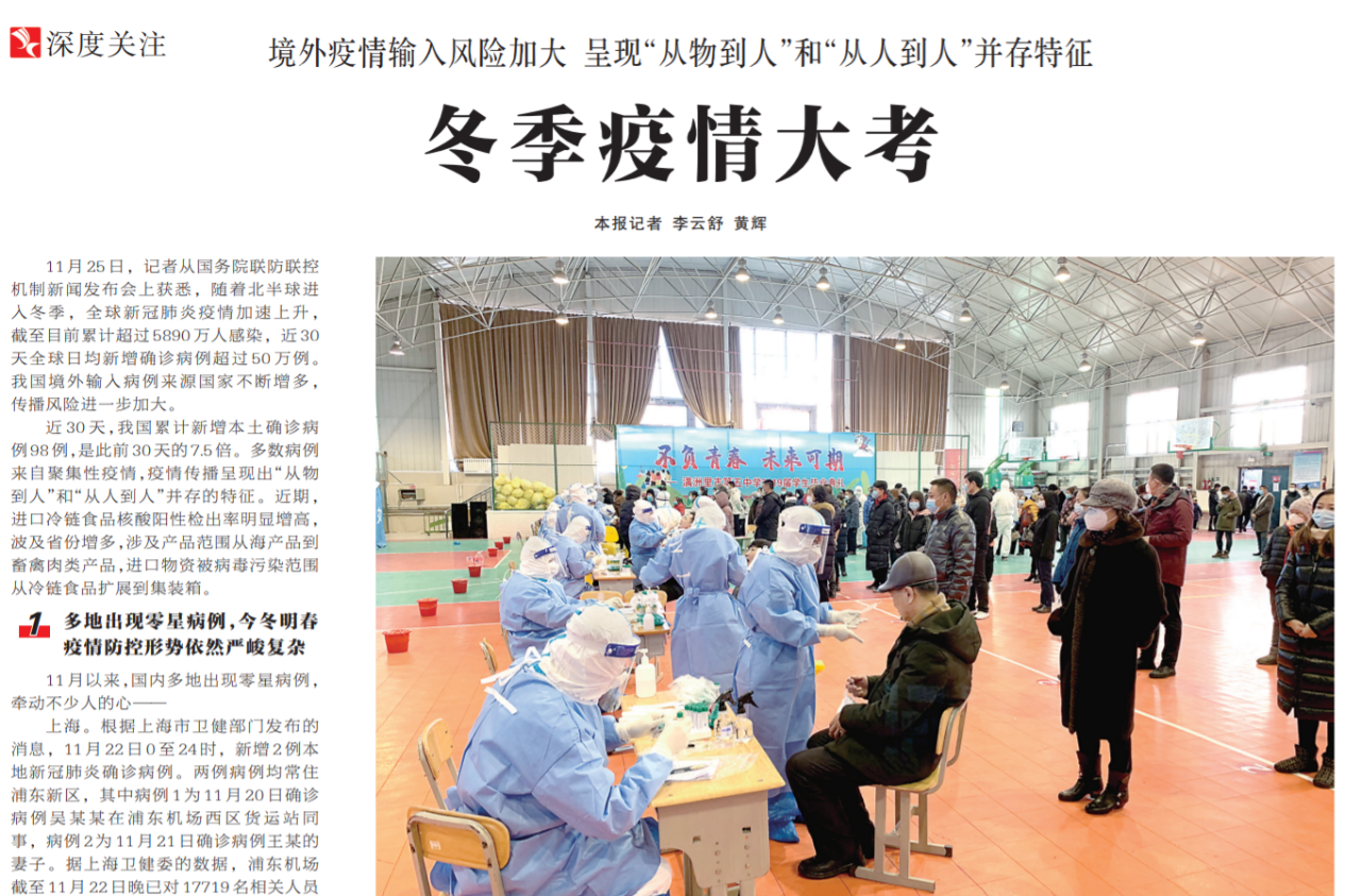 ●今天出版的中国纪检监察报深度关注专栏以《冬季疫情大考》为题,关注今冬明春疫情防控形势。报道指出:目前境外疫情输入风险加大,呈现“从物到人”和“从人到人”并存特征。纪检监察机关要加强监督检查,推动健全从“国门”到“家门”的疫情防控措施。