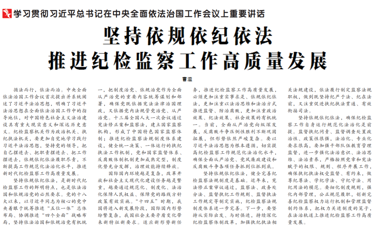 ●今天出版的中国纪检监察报头版发表文章《坚持依规依纪依法 推进纪检监察工作高质量发展》。文章指出:纪检监察机关作为政治机关、执纪执法机关,要更加自觉地学习践行习近平法治思想,坚持党的领导,把自己摆进去、把职责摆进去、把工作摆进去,依规依纪依法履职尽责,不断提高工作规范化法治化水平,推进新时代纪检监察工作高质量发展。